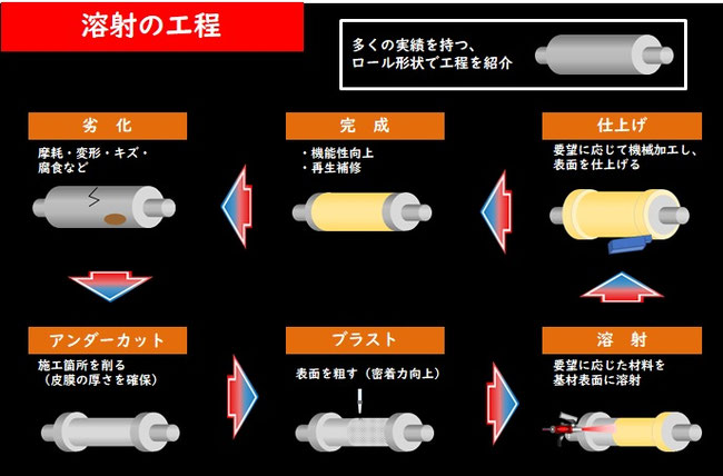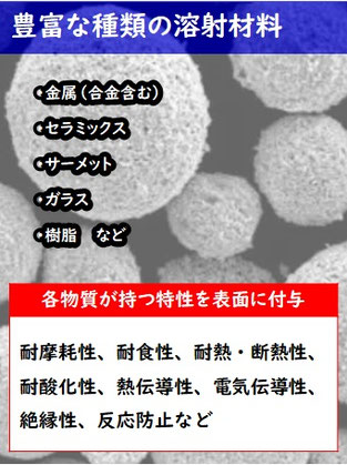 溶射材料は豊富な種類があり、要望の特性を基材表面に付与することができ、長寿命化・軽量化・高機能化に繋げることが可能である。